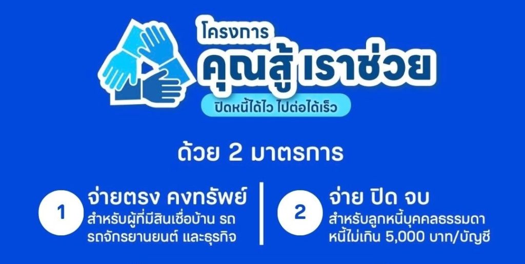 “คุณสู้เราช่วย” เป็นโครงการจากธนาคารแห่งประเทศไทย (ธปท.) ร่วมกับสถาบันการเงินต่าง ๆ เพื่อช่วยลูกหนี้รายย่อยและ SMEs ที่มีปัญหาหนี้สิน ให้กลับมาตั้งตัวได้อีกครั้ง โดยมีมาตรการช่วยเหลือหลัก ๆ 2 แบบ คือ “จ่ายตรง คงทรัพย์” ช่วยคนที่อยากรักษาบ้าน, รถ, หรือทรัพย์สินไว้ และ “จ่าย ปิด จบ” ช่วยคนที่อยากปิดหนี้ไว
